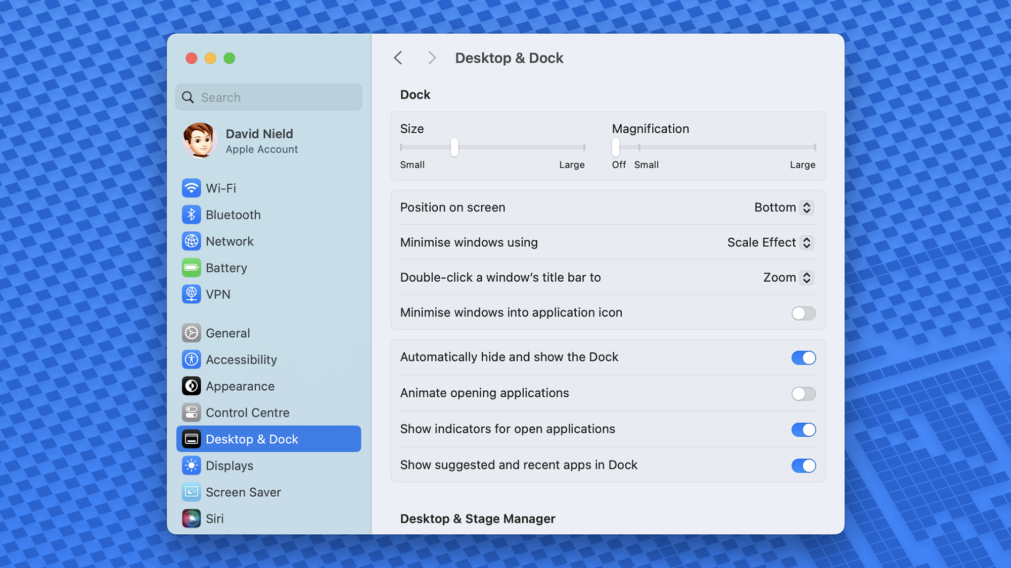 在清理擴展塢時,您還有一些內置的 macOS 設置 - 打開蘋果菜單,然後選擇系統設置並選擇桌面和擴展塢去看他們。從這裡,您可以在不使用時隱藏擴展塢,隱藏建議的和最近的應用程序快捷方式,以及打開或關閉應用程序啟動動畫。您還可以放大或縮小擴展塢。