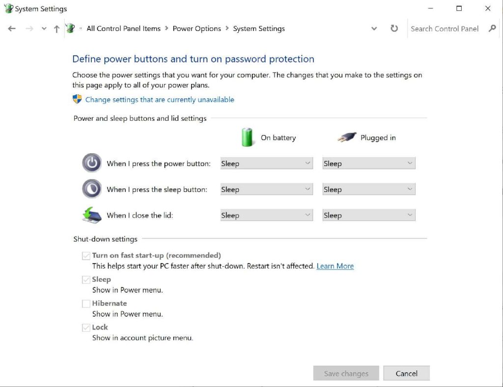 - 第4步:選擇 ”睡覺或者冬眠”從下拉菜單中並保存更改。然後,合上蓋子以確保筆記本電腦不會打開。