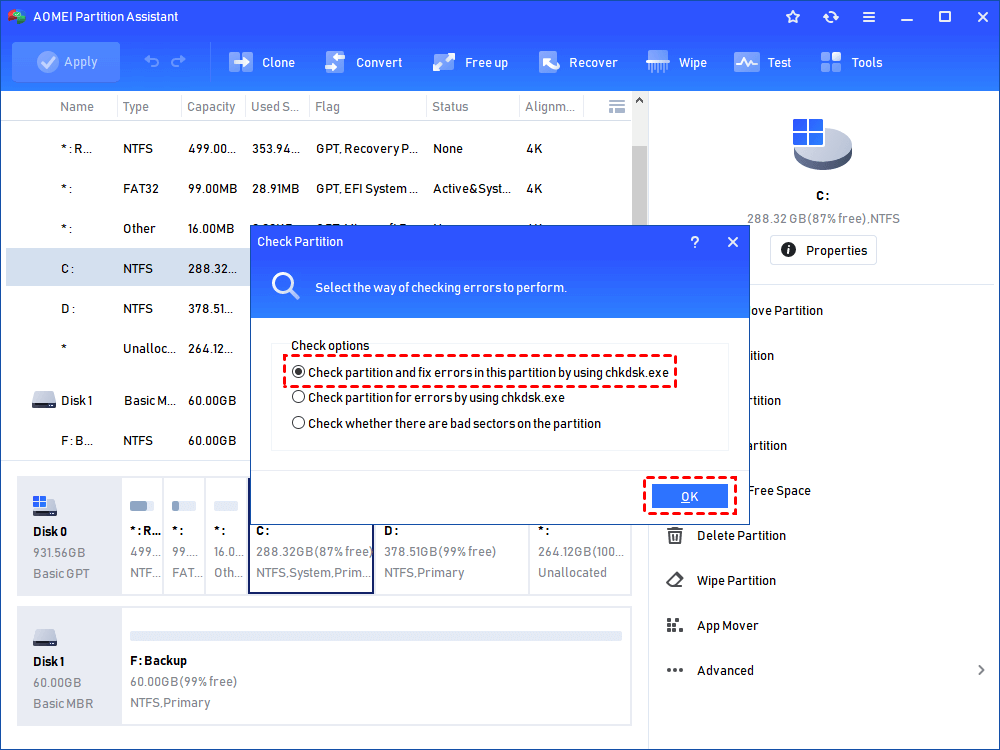 • 使用 chkdsk.exe 檢查分區是否有錯誤:該選項僅識別錯誤。