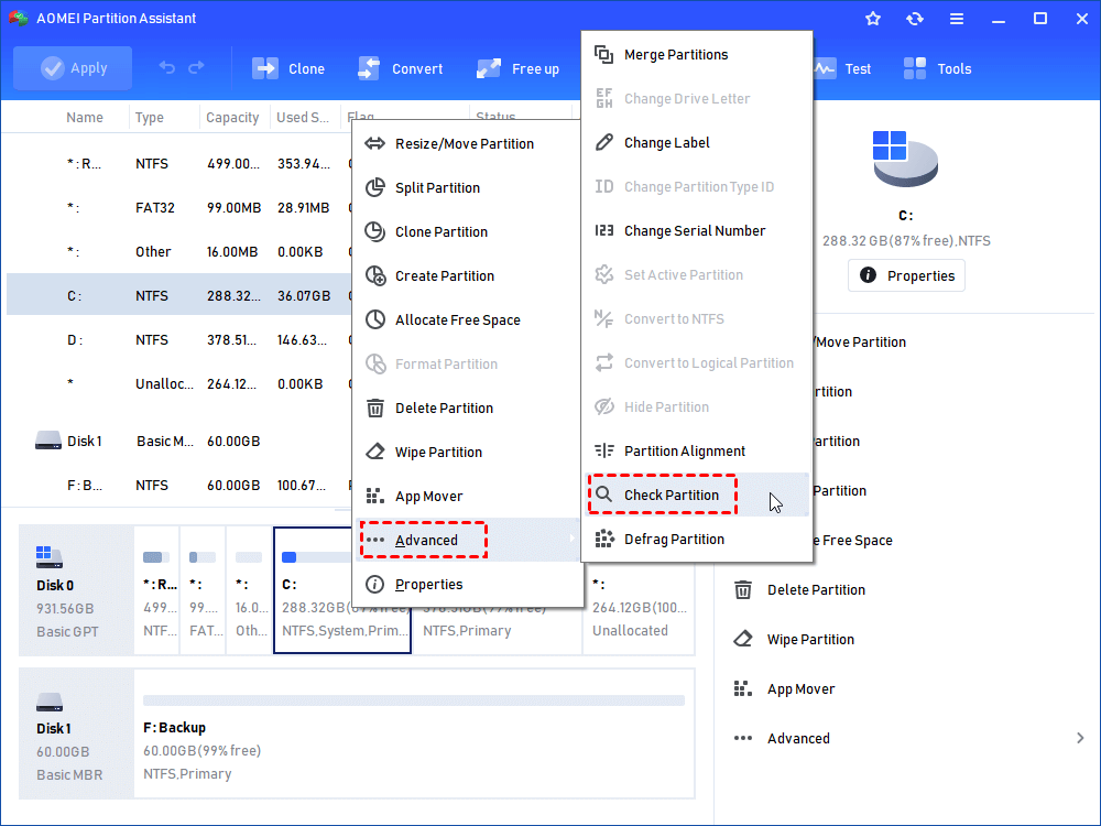 步驟1.右鍵單擊C盤,選擇“高級”,然後選擇“檢查分區”。