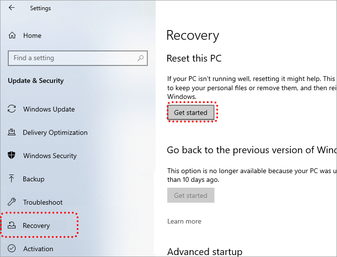 步驟 2:在新窗口中,單擊“恢復”,然後選擇“重置此電腦”下的“開始”。