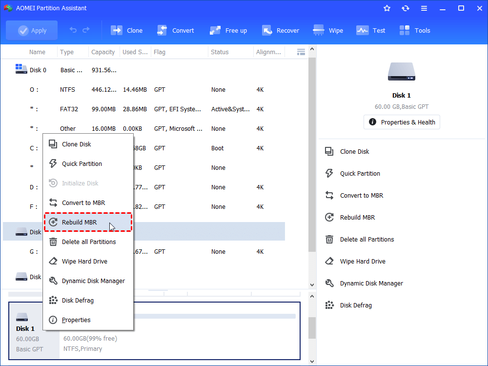 步驟4、檢查完畢後,選擇無法啟動的系統盤。右鍵單擊磁盤並選擇“重建 MBR”。或者,您可以導航到磁盤工具的左側界面,然後選擇“磁盤操作”,然後選擇“重建 MBR”。