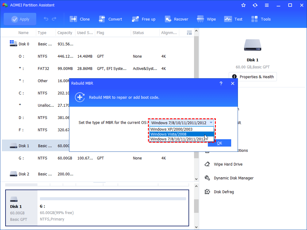 步驟 5. 在“重建 MBR”窗口中指定要重建的 MBR 類型。