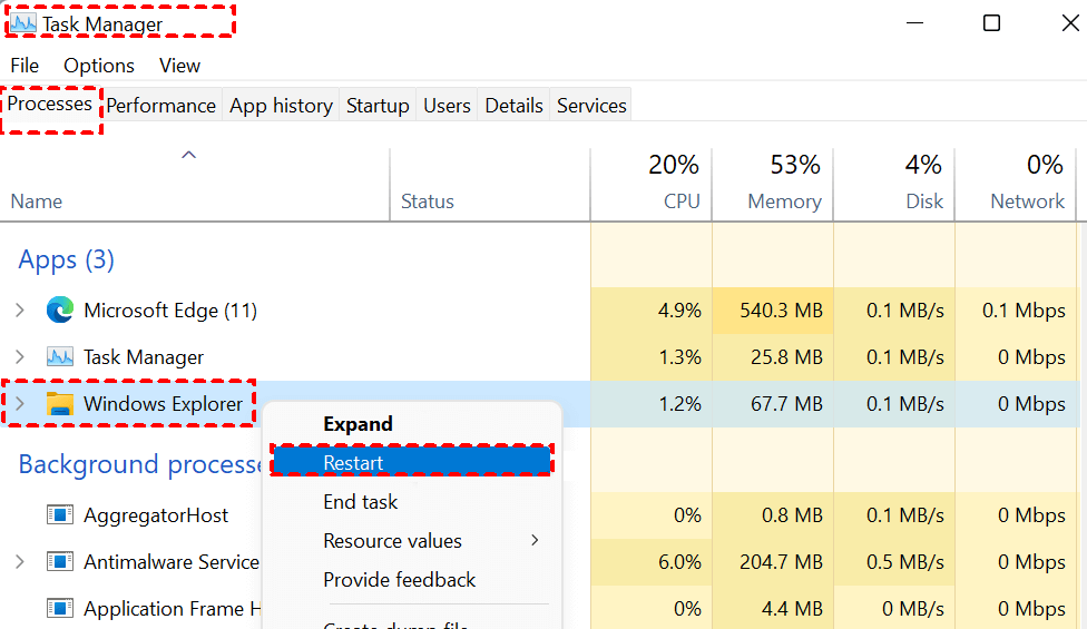 步驟 2:找到並右鍵單擊“Windows 資源管理器”,然後選擇“重新啟動”。文件資源管理器將自動重新啟動,任務欄和桌面將重新加載。