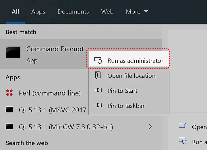 步驟1:按“Windows”鍵,鍵入“cmd”,然後單擊“以管理員身份運行”以使用管理權限打開命令提示符。