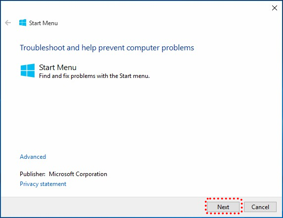 步驟 1:啟動 Microsoft 開始菜單疑難解答並單擊“下一步”。