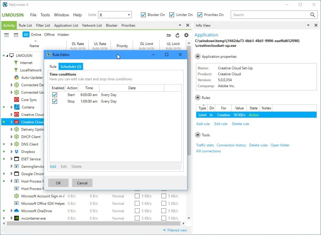 NetLimiter 向您顯示 PC 上的應用程序、程序和服務消耗了多少帶寬(向下和向上),並允許您設置它們可以利用的最大帶寬限制。就我而言,Adobe Creative Cloud 消耗了我有限的 250 KB/s (2.5Mb ADSL) 下載帶寬。