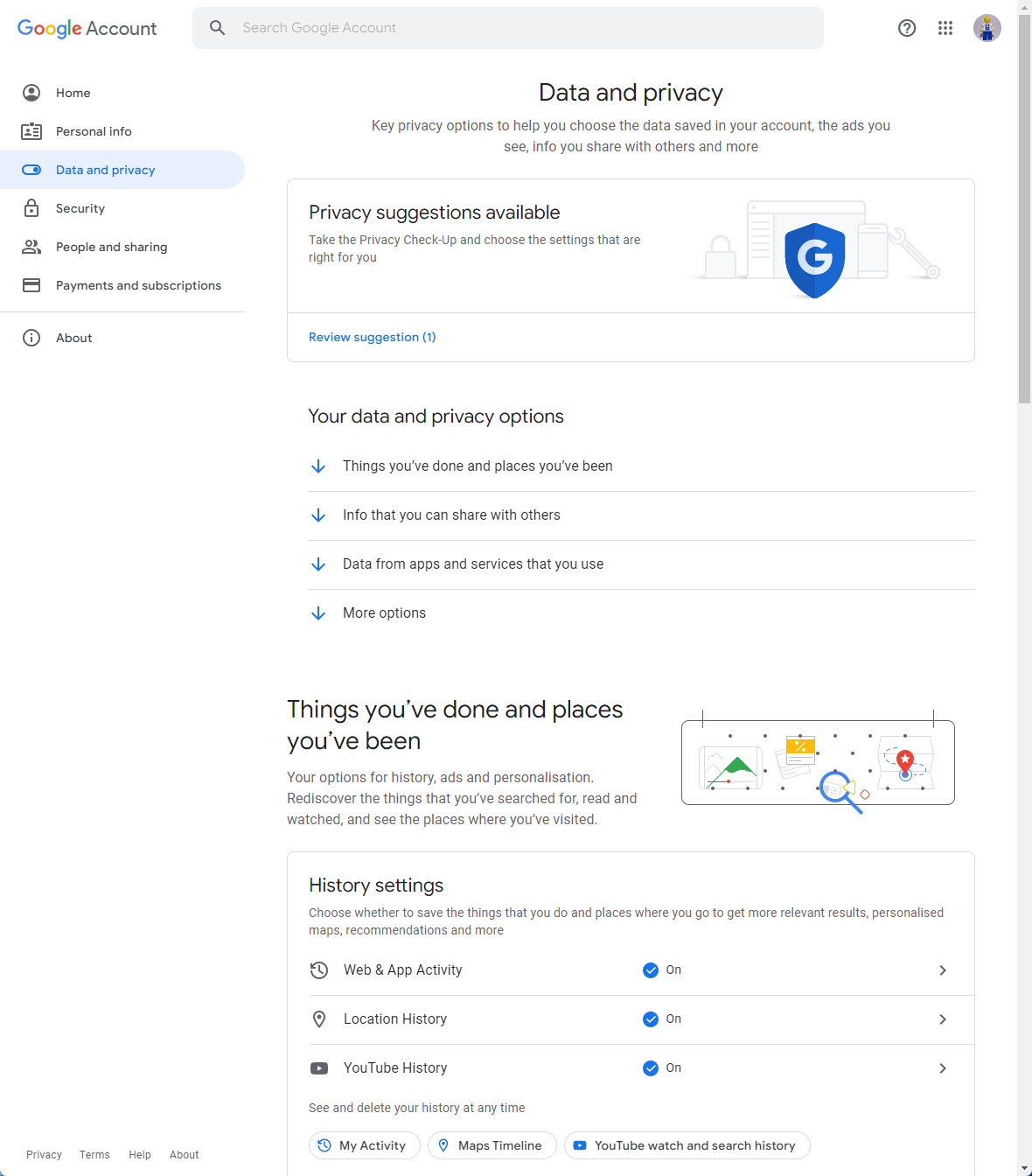 Google 還可以讓您輕鬆管理隱私的各個方面,您可以在谷歌帳戶網站。與微軟一樣,這裡有很多可用的選項,包括搜索、廣告、位置和地圖,還有母公司 Alphabet 的附加服務選項,包括 YouTube 和 Google Fit。