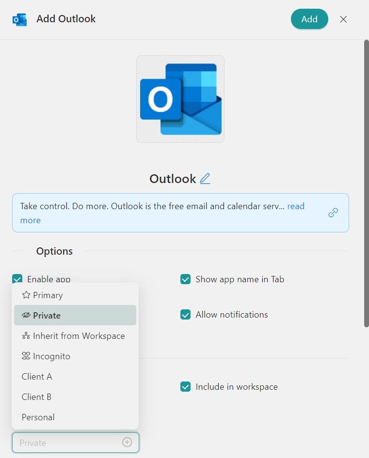 - 配置應用程序設置根據您的喜好。請記住,您可以選擇要在應用程序中使用的配置文件(從工作區繼承、主要配置文件、私有配置文件、隱身配置文件或自定義配置文件)。