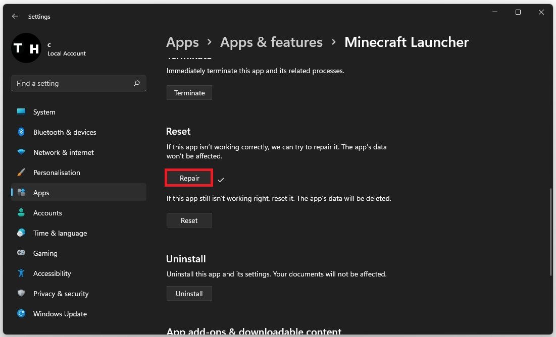 向下滾動並單擊維修,這將需要幾秒鐘的時間來通過重新下載任何丟失或損壞的文件來修復 Minecraft 啟動器文件。