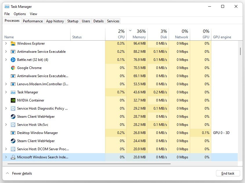 打開你的工作管理員通過在開始菜單搜索中搜索它。在流程選項卡,結束所有 Minecraft 遊戲和啟動器進程在後台運行。