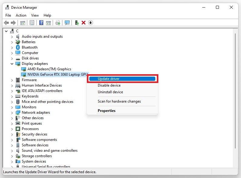 如果 Minecraft 啟動器問題仍然存在,請確保您的圖形驅動程序是最新的。打開你的裝置經理。擴展您的顯示適配器。右鍵單擊您的顯卡並選擇更新驅動程序。確保自動搜索驅動程序。