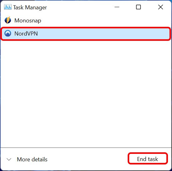 - 打開你的工作管理員並結束與 NordVPN 相關的任何進程。要在 Windows 上執行此操作,請選擇要結束的程序並單擊“結束任務”位於窗口的右下角。
