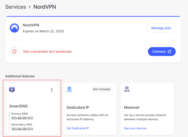 最後,NordVPN 的 SmartDNS 功能直接在智能電視上解鎖區域限制內容,無需加密您的互聯網連接,這使其成為不支持 VPN 的設備(如 Apple TV)的絕佳解決方案。