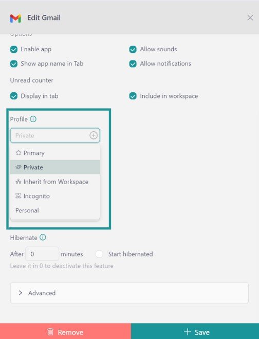 - 配置應用程序設置根據您的喜好。請記住,您可以選擇要在應用程序中使用的配置文件(從工作區繼承、主要配置文件、私有配置文件、隱身配置文件或自定義配置文件)。