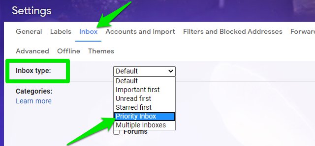 這裡移至“收件箱”選項卡並選擇“優先收件箱”從旁邊的下拉菜單中“收件箱類型”選項。