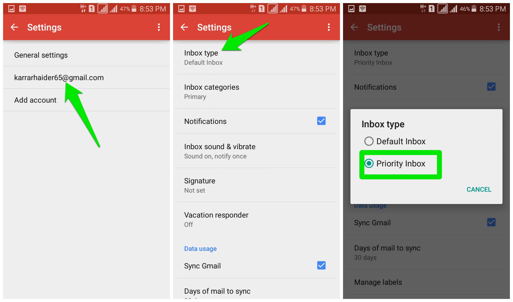 現在點擊您的電子郵件帳戶,然後點擊“收件箱類型”並選擇“優先收件箱”從它。