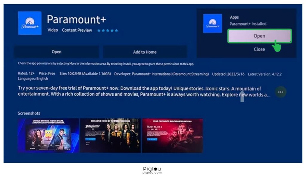 - 選擇“打開”選項開始派拉蒙 Plus 應用程序。