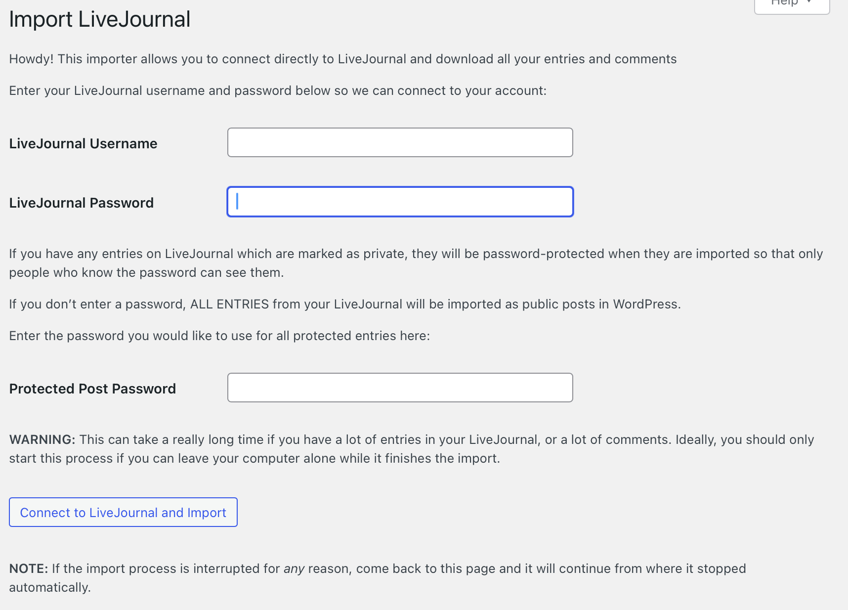 5.點擊連接到 LiveJournal 並導入,該過程將開始。這需要一段時間,而且看起來可能什麼也沒有發生。要有耐心,讓選項卡保持打開狀態,但如果您不小心關閉了它,也不要驚慌:您可以重新啟動導入器,它會從上次中斷的地方繼續。最終您會被告知該過程已完成。您現在已經備份了 LiveJournal 帖子和評論 - 檢查所有內容是否都在那裡。