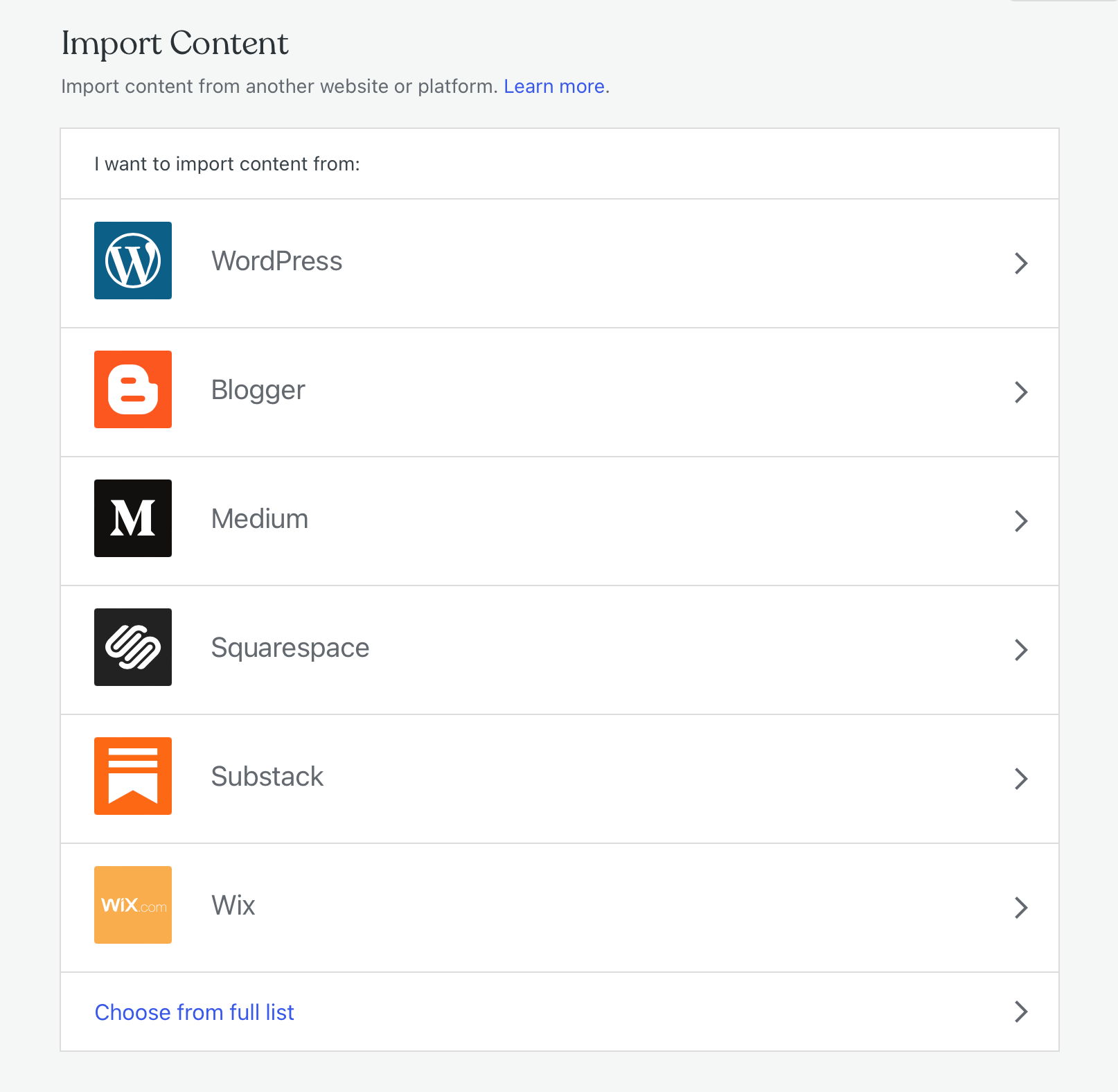 2.您將看到幾個選項,但都不是 LiveJournal。點擊從完整列表中選擇在底部。