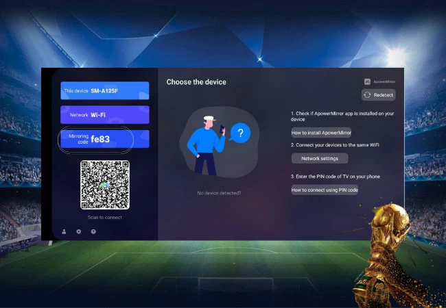 使用ApowerMirror將2022年世界杯的激烈賽事帶回家。這款屏幕鏡像應用程序因其跨不同平台(包括 iOS、Android、Mac、Windows 和智能電視)鏡像設備的能力而享譽全球。因此,它可以通過手機將 2022 年世界杯精彩地直播到電視上。它可以在鏡像過程中提供無與倫比的手機視圖,同時提供持續數小時的穩定連接。它甚至還配備了一些內置工具,例如屏幕錄製,您可以使用它來錄製今年世界杯的每場比賽。要使用該應用程序,以下是您需要遵循的步驟列表。