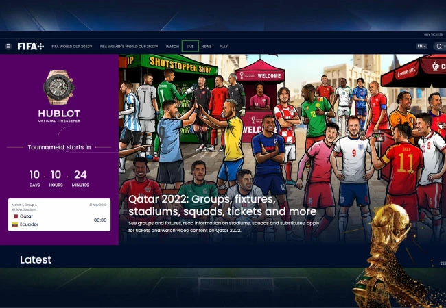 - 搜尋國際足聯世界杯和登入。然後,轉到下面居住觀看比賽。