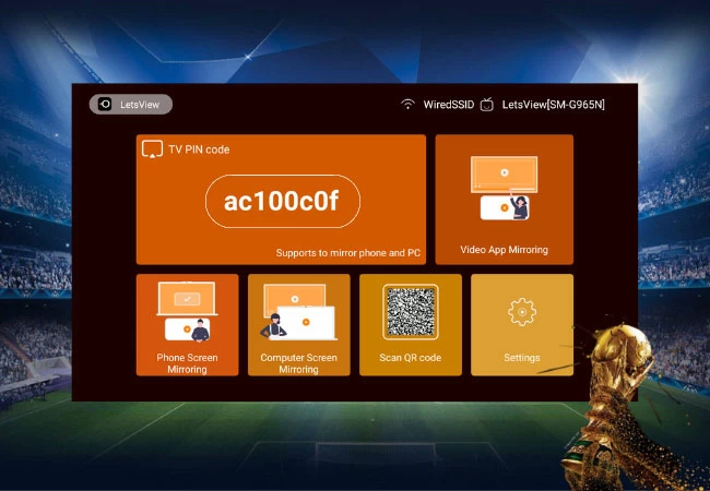 - 在您的手機上,單擊星號圖標手機右上角並輸入密碼顯示在您的電視上。最後,按M按鈕鏡像。鏡像後,啟動手機上的世界杯應用程序即可在電視上觀看。