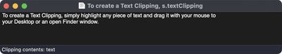 這會將突出顯示的文本(包括任何富文本格式)保存為.textclipping文件以您選擇的文本的前幾個單詞命名,但您可以輕鬆地重命名它以使其更易於識別。