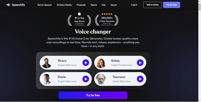 Speechify 女孩變聲器是另一個出色的應用程序,因其令人難以置信的性能而被列入我們的列表。通過人工智能集成,生成錄音室品質的人聲。超過 20 種不同的語言和口音讓您發揮創意並創建自定義聲音。
