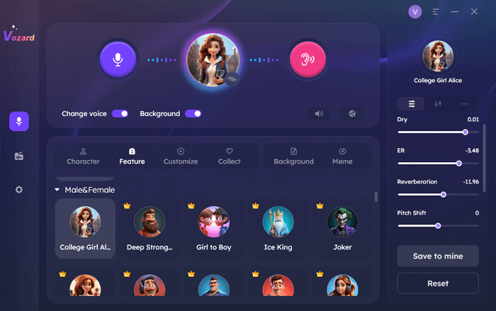 如果您正在尋找一款具有簡單功能的簡單應用程序,那麼適用於 PC 的最佳人工智能變聲器 – Vozard 就是您的最佳選擇!通過AI技術,你可以發出女聲。 Vozard 提供 180 多種聲音效果,其中包括 90 多種 AI 語音效果。無論您是想讓在線聊天變得更有趣,還是想通過將您的聲音變成您最喜歡的遊戲角色來給您的隊友帶來驚喜,Vozard 都是正確的選擇。