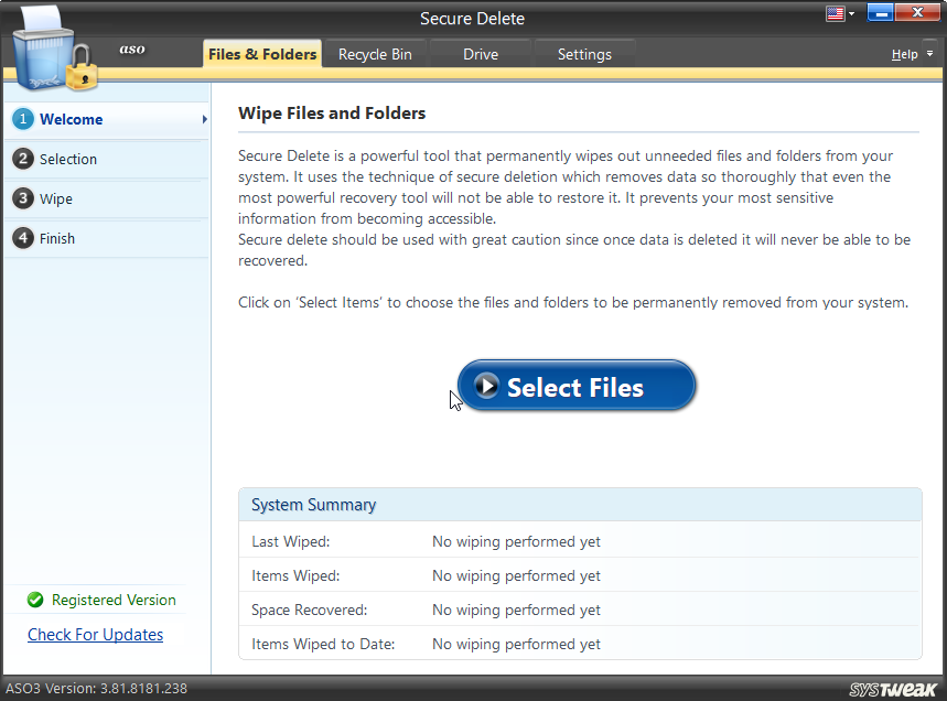 當您打算贈送您的電腦時,您總是要對其進行格式化。每個人都這樣做!但您知道刪除的數據可以輕鬆恢復嗎?如果您只是刪除了文件或對其進行了格式化,則有一些工具可以從磁盤中檢索該文件。然而,借助安全刪除,您無需擔心恢復,因為它會將整個數據粉碎到其核心。該模塊會永久擦除已刪除的文件和文件夾,甚至有助於清理回收站。此外,您可以擦除硬盤驅動器,使數據完全無法恢復。