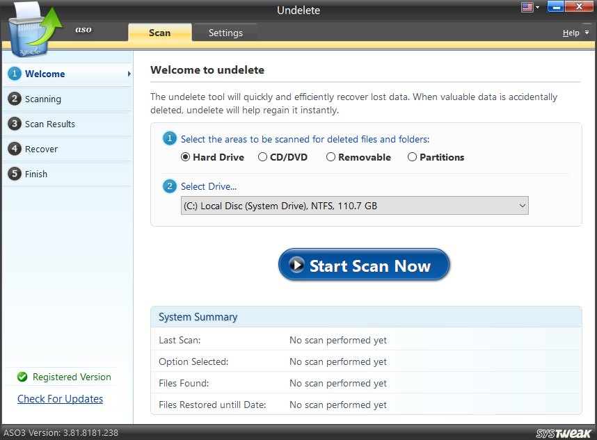 單擊開始 Smart PC Care 按鈕執行掃描並確定將掃描哪些區域。查看預先選擇的基本系統掃描,然後單擊“開始掃描”開始該過程。