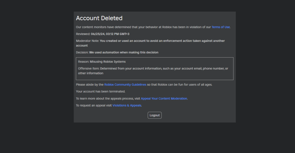 - “帳戶已刪除”:此消息表示 Roblox 正在評估該帳戶是否存在潛在違規行為,這可能會導致臨時或永久封禁。