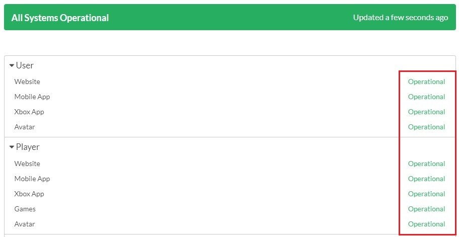 首先,確保 Roblox 服務器正常運行,因為此問題通常是由網絡或服務器問題引起的。導航至status.roblox.com。在這裡,展開用戶和玩家並確保服務器正常運行。如果不是這種情況,您將不得不等待服務器維護完成。