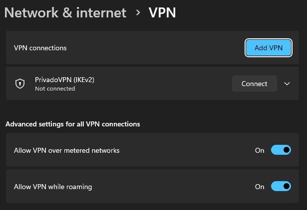 如果問題仍然存在,請打開 Windows 設置。在下面網絡與互聯網,點擊VPN並確保您的 VPN 連接已禁用。 VPN 非常有用,但它也可能導致 Roblox 出現網絡錯誤。如果您正在尋找可靠的 VPN 連接,我們建議私人VPN。