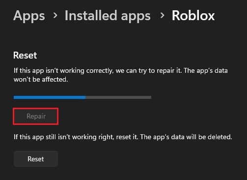 單擊右側的漢堡菜單圖標並選擇高級選項。向下滾動並單擊維修。這將需要幾秒鐘的時間來確保您的 Roblox 文件完整且最新。