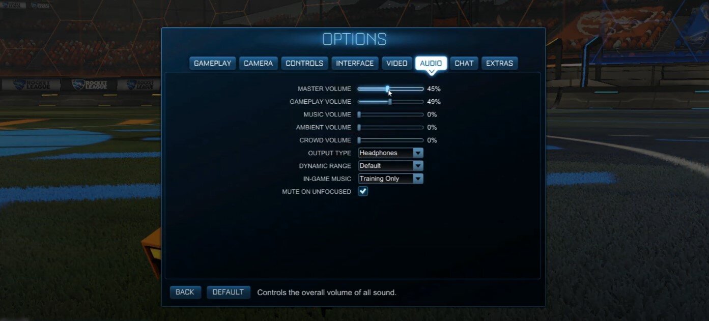 在遊戲中瀏覽火箭聯盟音頻設置。將這些音量滑塊設置為您的首選值。設定輸出類型至揚聲器或耳機。驗證音頻設置後,您可以關閉遊戲。