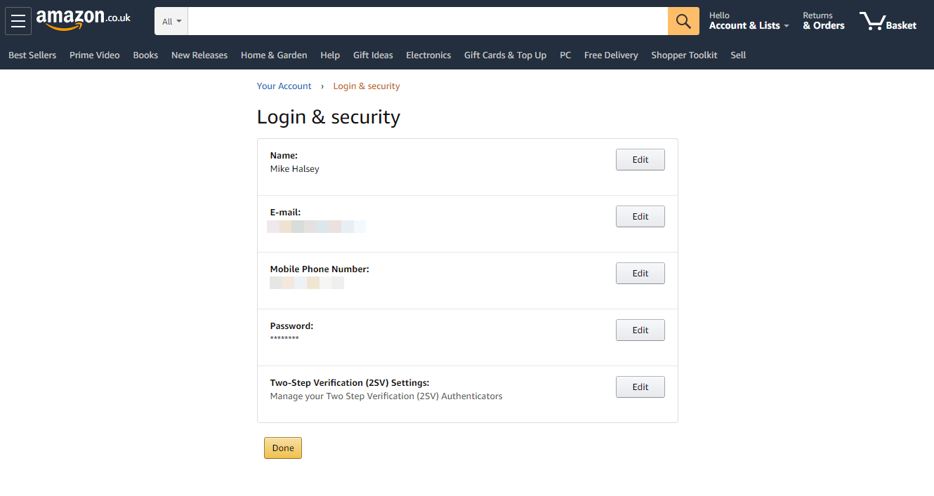 亞馬遜的雙因素身份驗證設置可以在您的帳戶 > 登錄和安全中找到。這是一個非常簡單的界面,您將在其中看到列出的兩步驗證 (2SV) 設置。只需單擊“編輯”按鈕即可開始設置。