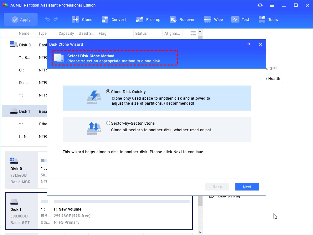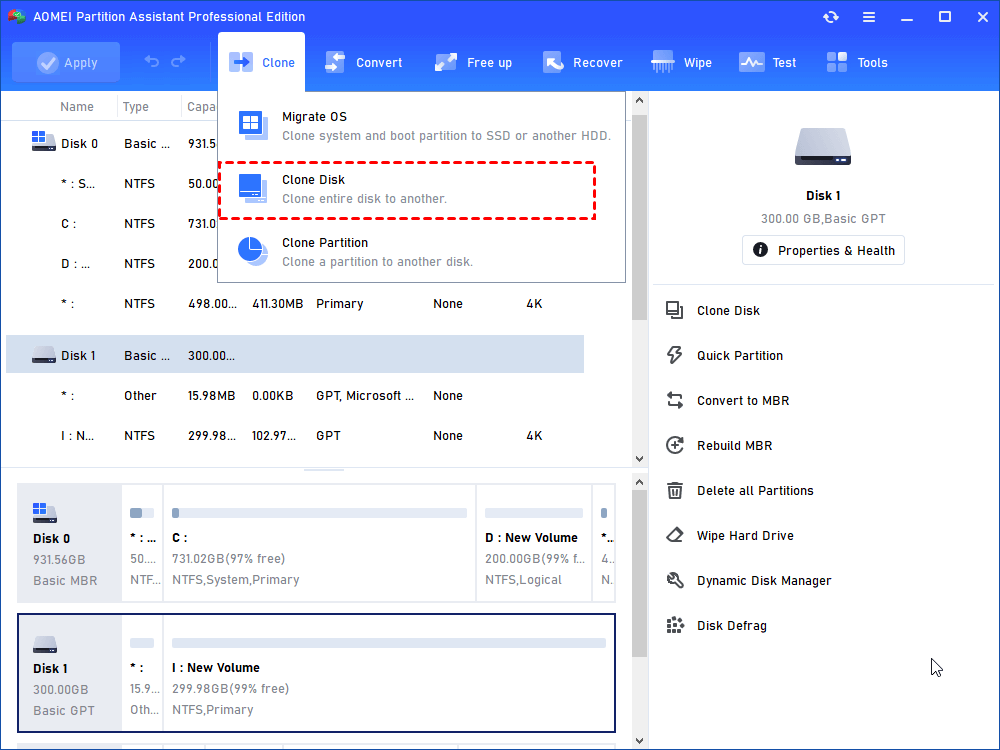步驟1.安裝並打開IEMOA分區助手專業版。單擊右側菜單中的“克隆磁盤”。