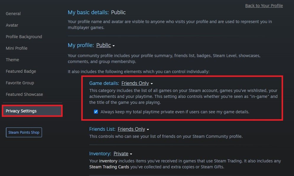 在您的個人資料設置中,確保您處於隱私設置部分。設定遊戲詳情選項僅限朋友或者私人的。這將向公眾隱藏您的 Steam 帳戶上的所有遊戲列表、您的願望清單、成就以及您個人資料上的遊戲活動和遊戲時間,包括或不包括您的好友列表。