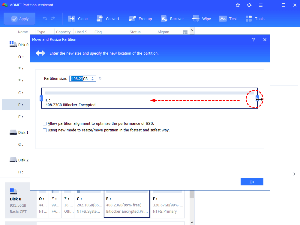 2. 如果 BitLocker 分區位於所選分區的左側,請向右拖動以在 BitLocker 區域後面生成未分配的空間。