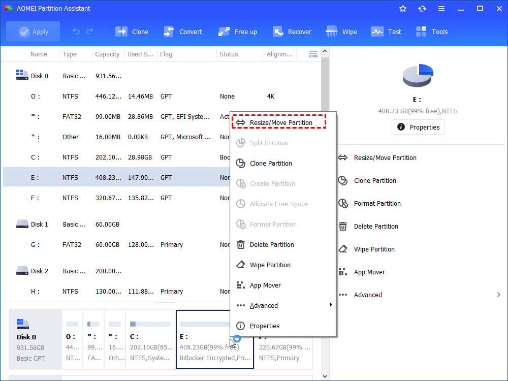 它是一款免費的磁盤和分區管理器軟件,兼容Windows 11/10/8/8.1/7計算機。借助這個強大工具提供的“調整大小/移動分區”功能,用戶只需單擊幾下即可輕鬆解鎖 BitLocker 分區。這使他們能夠輕鬆調整分區大小或在磁盤上創建新分區,從而克服其他方法的限制。