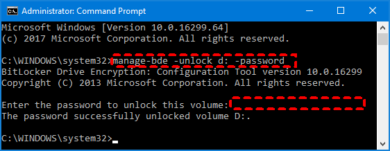 步驟 3. 輸入“manage-bde -unlock d: -password”,然後按 Enter 鍵。