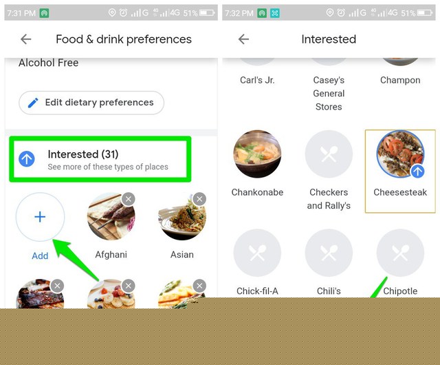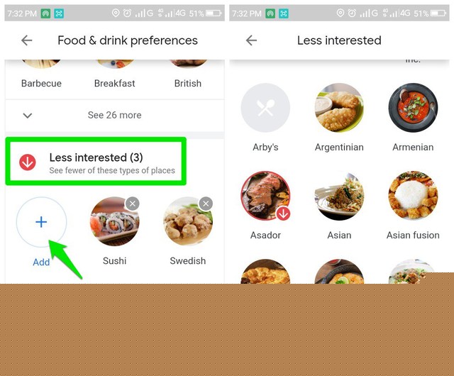 這“不太感興趣”部分的工作方式相同。只需點擊“添加”在這裡,它將列出所有食物類型,您可以從中選擇您不感興趣的食物類型。