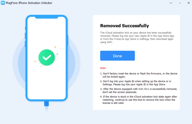 步驟 3.之後,單擊“開始”開始繞過激活鎖。保持設備連接,直到該過程完成。之後將設備設置為新設備。
