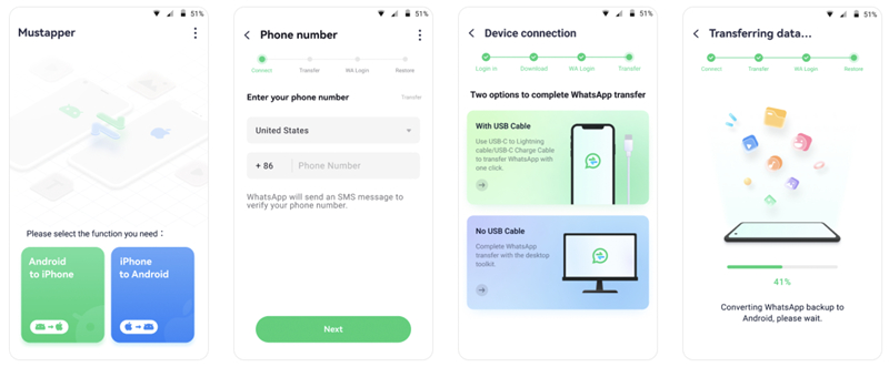 iMyTrans 是一款可在 iPhone 和 Android 上使用的移動應用程序。使用iMyTrans,您無需電腦即可實現iPhone和Android之間的WhatsApp傳輸。只需一根數據線即可傳輸和合併 WhatsApp 數據。在沒有電腦的情況下這個方法就方便多了。無論您在什麼系統之間切換,iMyTrans 都為您提供穩定、快速的傳輸。