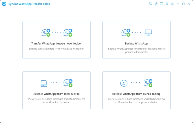 Syncios是另一款專注於WhatsApp傳輸的軟件。與其他應用程序不同,它集中在 WhatsApp 中。您可以在兩個設備之間傳輸 WhatsApp、備份 WhatsApp 以及從本地備份和 iTunes 備份恢復 WhatsApp。如果您喜歡單一功能的應用程序,Syncios 可能是您的考慮之選。