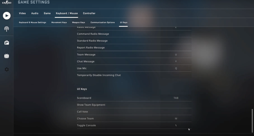 要訪問 CSGO 中的控制台命令,您必須首先啟用開發者控制台。為此,請導航至遊戲設置並找到“UI Keys”選項。確保您為“切換控制台”選項設置了一個鍵。完成後,您可以在遊戲過程中按指定鍵打開控制台並開始輸入命令。