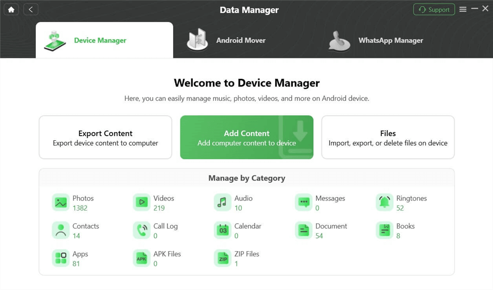 步驟 1. 在您的計算機上免費下載並啟動 DroidKit。然後選擇數據管理器進而裝置經理模式。
