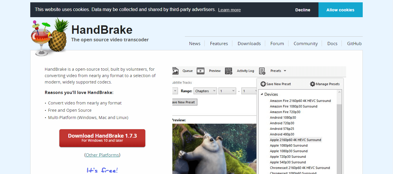 一種著名的開源視頻轉換器稱為 HandBrake。它以易於使用和多功能而聞名。該工具可以轉換視頻幀速率並支持多種格式。